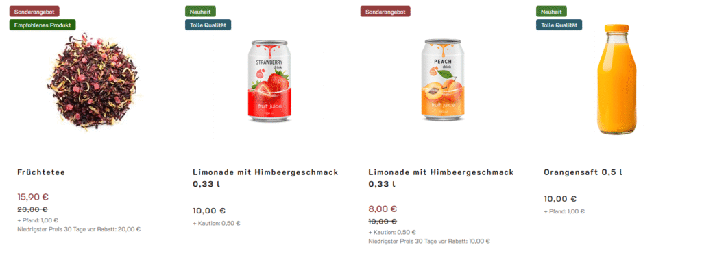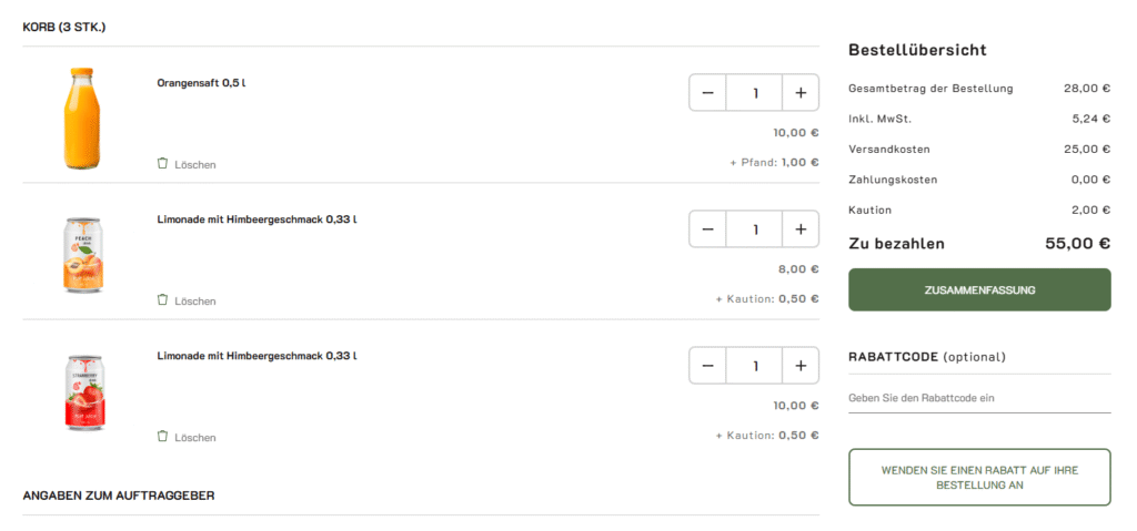 - Automatische Berechnung des Pfands: Der Wert und die Menge des Pfands werden automatisch zur Bestellung hinzugefügt und sind überall sichtbar, wo der Produktpreis angezeigt wird.